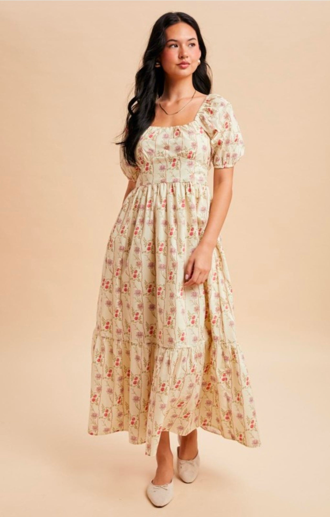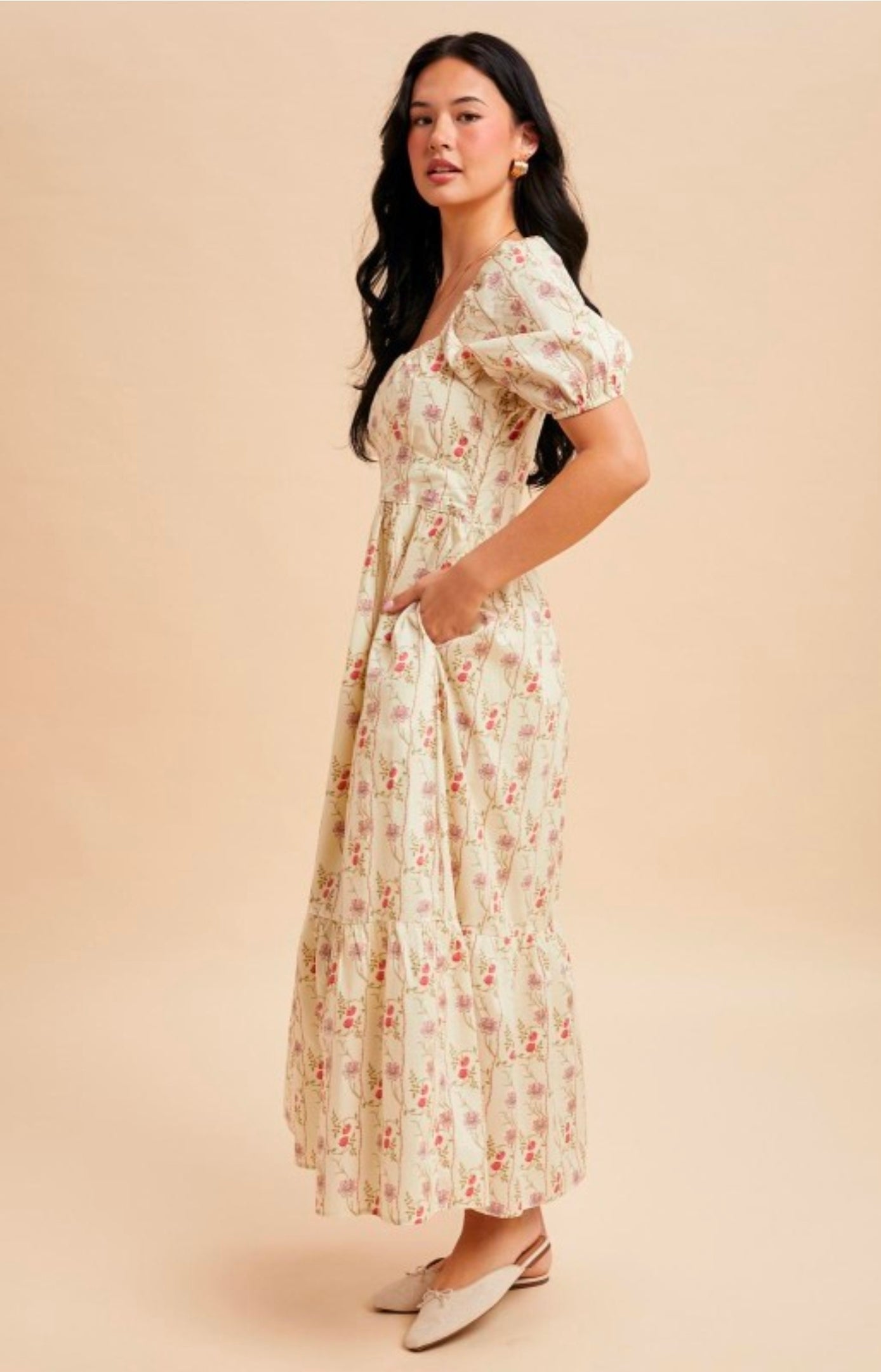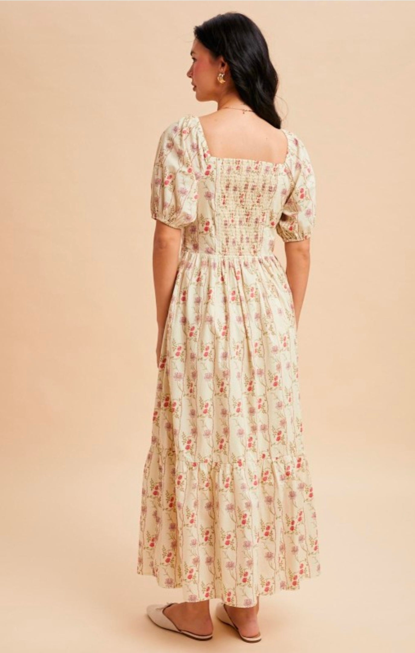 Cotton fabrication, Square neckline, puff elastic sleeve, side pockets, partially Smoked back bodice, full lining