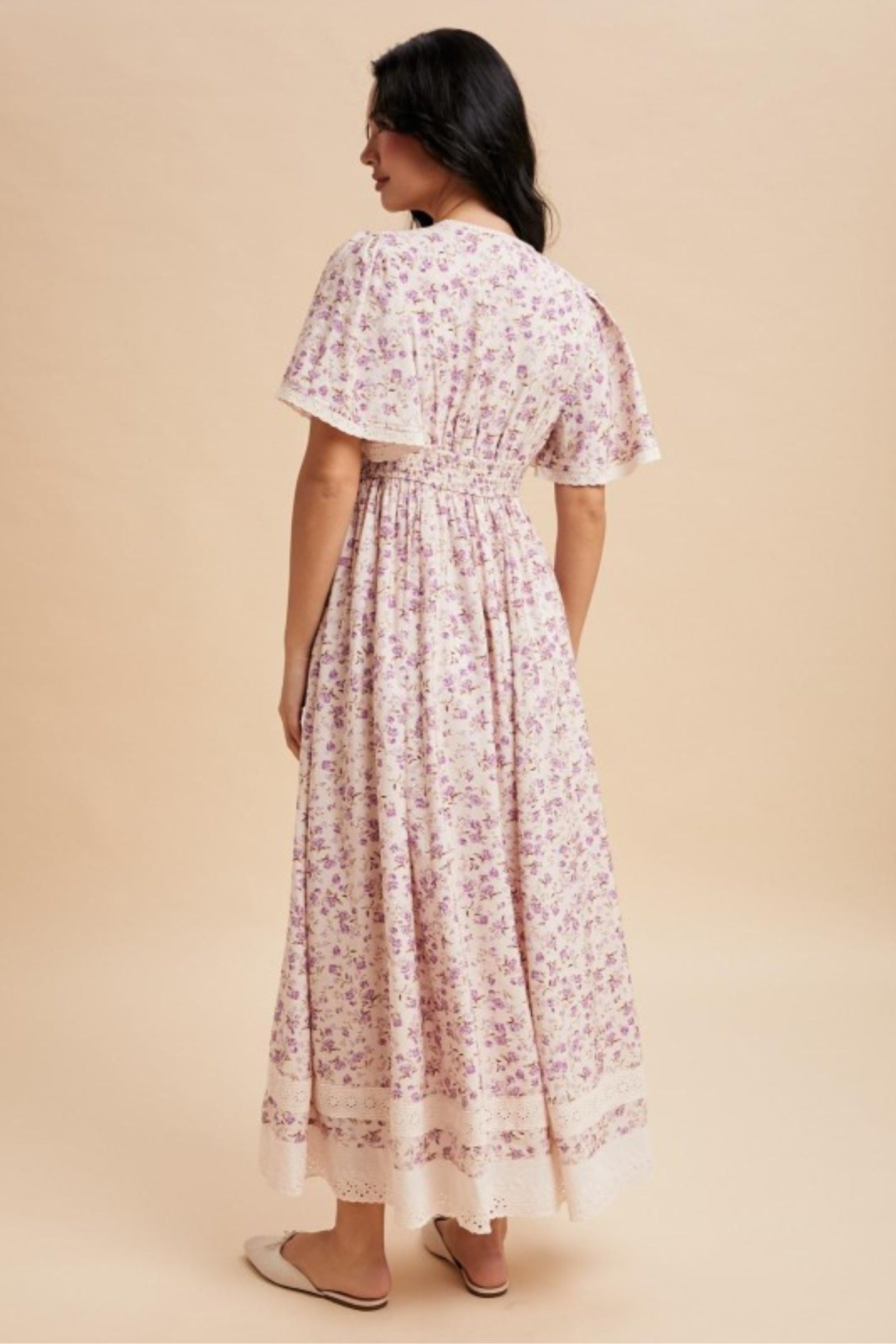 This beautiful dress has lace trim accents, with flutter sleeves, side pockets, Smoked waistband front and back and also fully lined